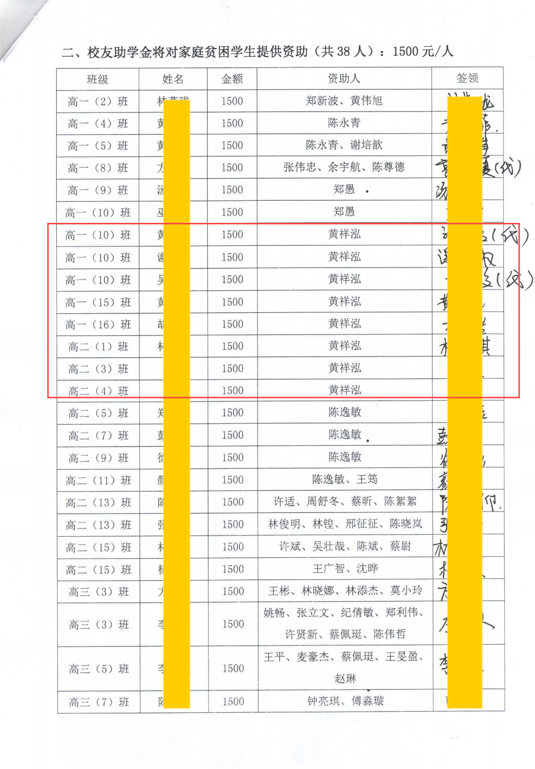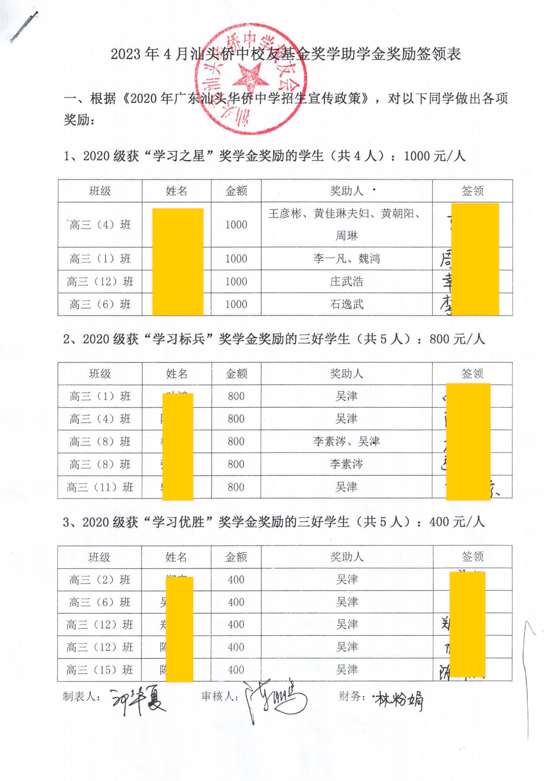 根据广东汕头华侨中学关于奖助学金发放的相关要求,经学生个人申请、学生处考核确定,2023年度第一轮助学或的那个拟帮扶家庭贫困学生和特别困难家庭学生共38名,按照1500元/人标准发放,具体名单详见广东汕头华侨中学反馈的相关执行资料:(为保护受助者隐私,对受助者个人信息进行了模糊处理)